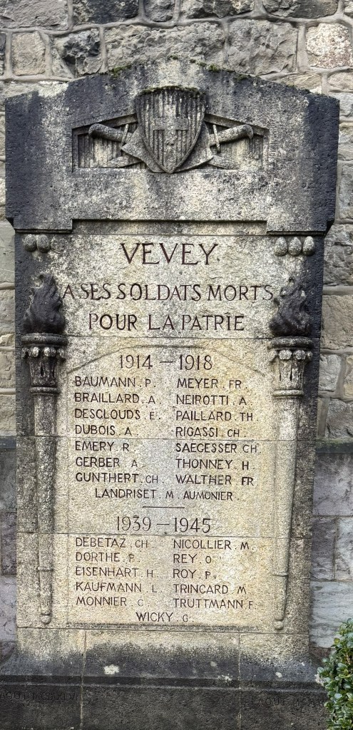 A marker on the east side of Église Saint-Martin commemorates Swiss citizens who died protecting their country. The monument displays the names of fifteen people from World War I and eleven from World War II. The inscription above the names reads “Vevey to its soldiers who died for the homeland.” Nearly 3,000 Swiss soldiers died during World War I. The Spanish Flu was the main factor, killing more than half of them. In the second World War, 100 civilian deaths—and no soldier deaths—were reported.