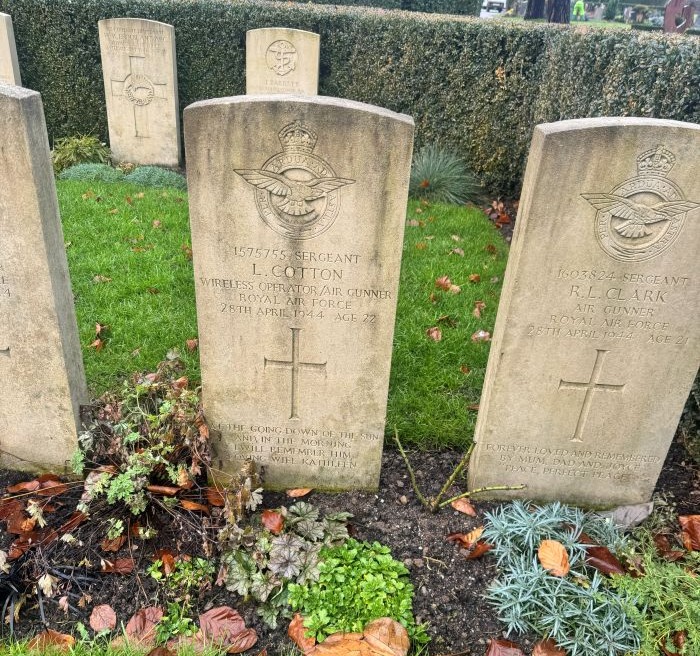 The crew members buried next to one another at the Vevey cemetery are Pilot Robert Ridley, Flight Engineer John Eaton, Sergeant Leslie Cotton, Sergeant Ross Clark, and Sergeant Allan Weir. Except for Eaton, whose age is not recorded, all the dead crewmen were in their early twenties.